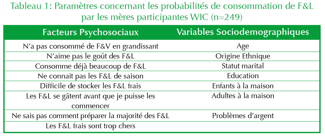 Les facteurs psychosociaux de notre étude se focalisaient sur les préférences personnelles et les facteurs de motivation de la consommation de F&L des participants. Au total 8 types de préférences personnelles et de motivation ont été évalués (Tableau 1) selon 3 réponses possibles : ‘‘Pas d’accord’’, ‘‘D’accord’’ et ‘‘Neutre.’’ Sept variables sociodémographiques ont été identifiées (Tableau 1).