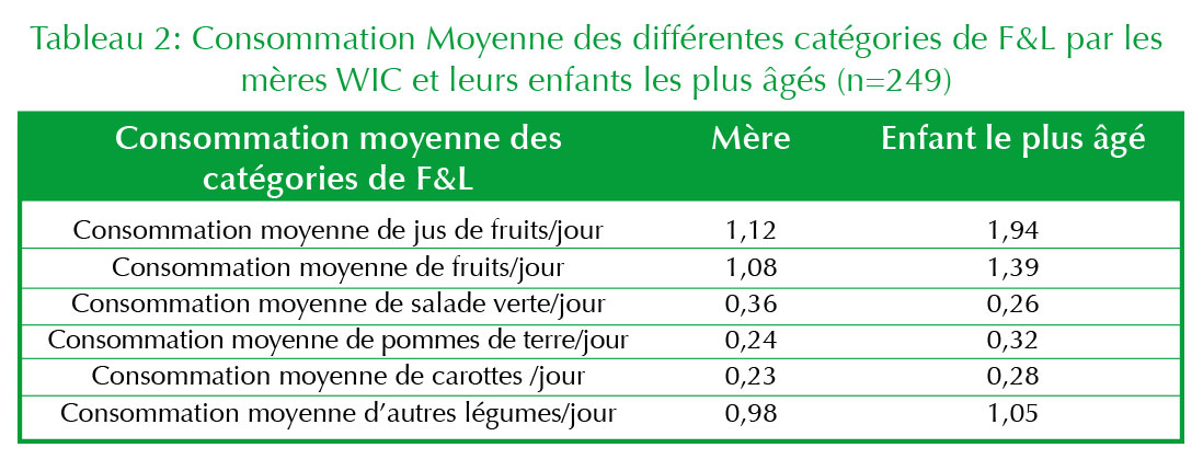 La consommation quotidienne moyenne totale des F&L chez les mères était de 3,92 portions et de 5,25 portions chez l’enfant le plus âgé.